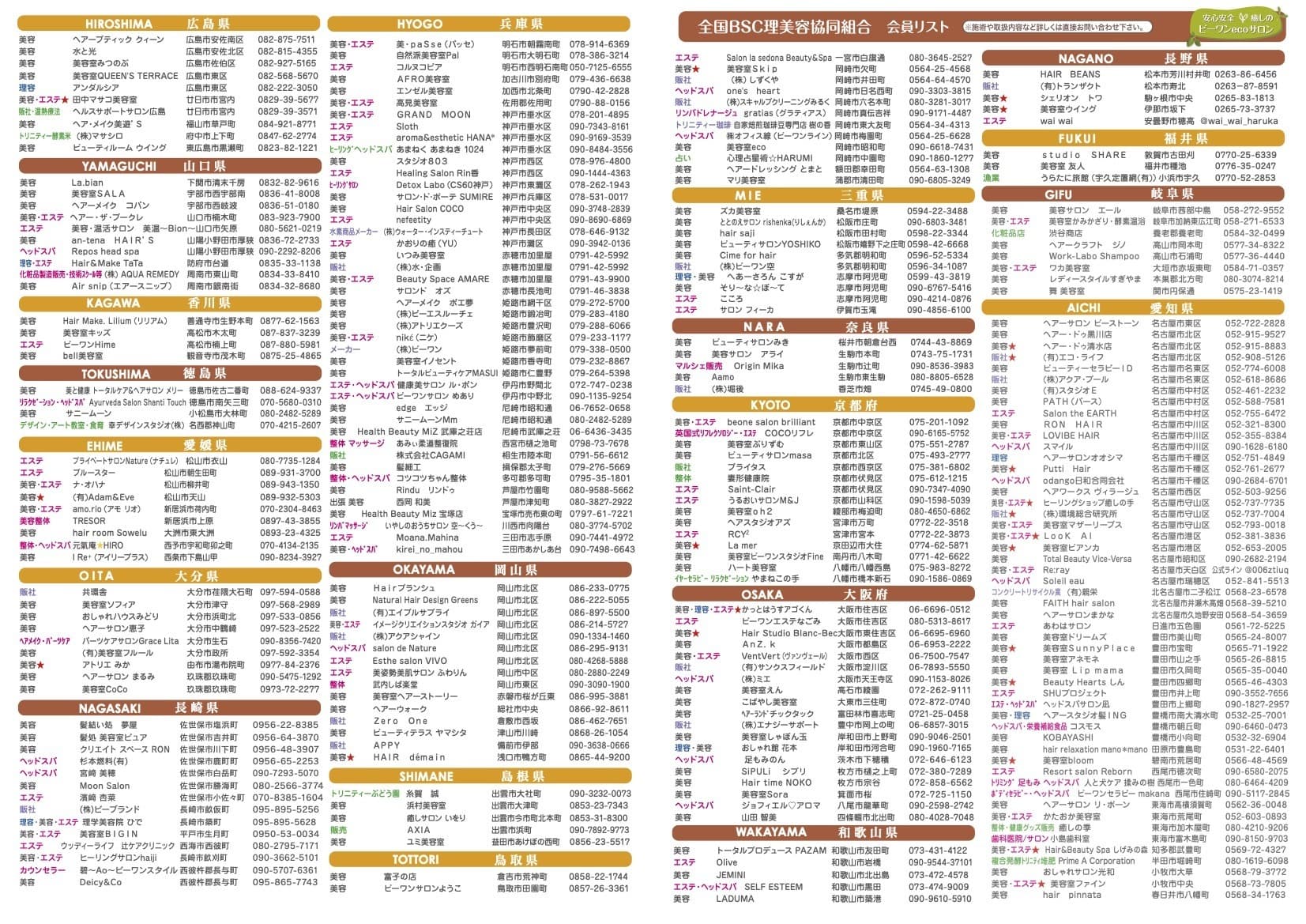 HOME | お近くの店舗検索 | BSC会員リスト 全国のBSC会員の一覧です。(一部非公開の会員を除く) 遠方のかたへのご紹介や、プリントアウトにもご活用ください。 ●BSC会員リスト 北海道-静岡>> ダウンロード ●BSC会員リスト 岐阜-福岡>> ダウンロード ●BSC会員リスト 佐賀-沖縄>> ダウンロード * ★印は 訪問美容のお取り扱いのあるサロンのご紹介です。 内容等異なりますので、詳細は直接お問い合わせください。 (対応させていただけない場合もございます) 店舗検索へ戻る