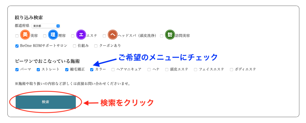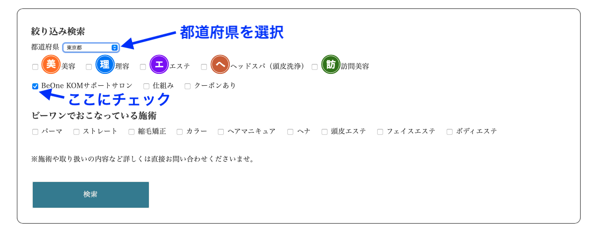 ※チェックなしの場合は選択した都道府県全てのBeOneKOMサポートサロンが表示されます。